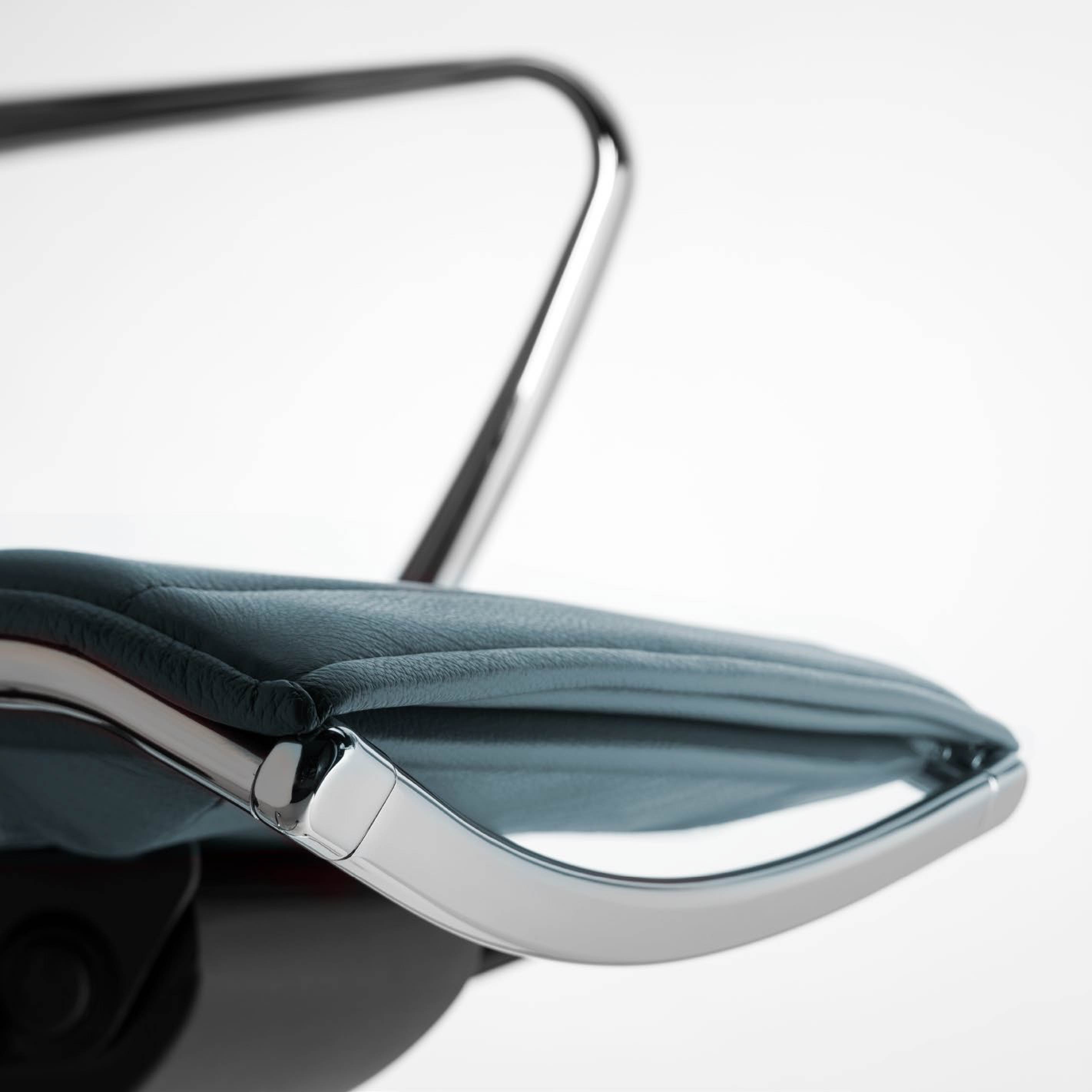 Tutta la performance del design di AliaC, impreziosita da un rivestimento in morbida pelle e da un doppio traverso, sia sopra lo schienale che sotto la seduta.